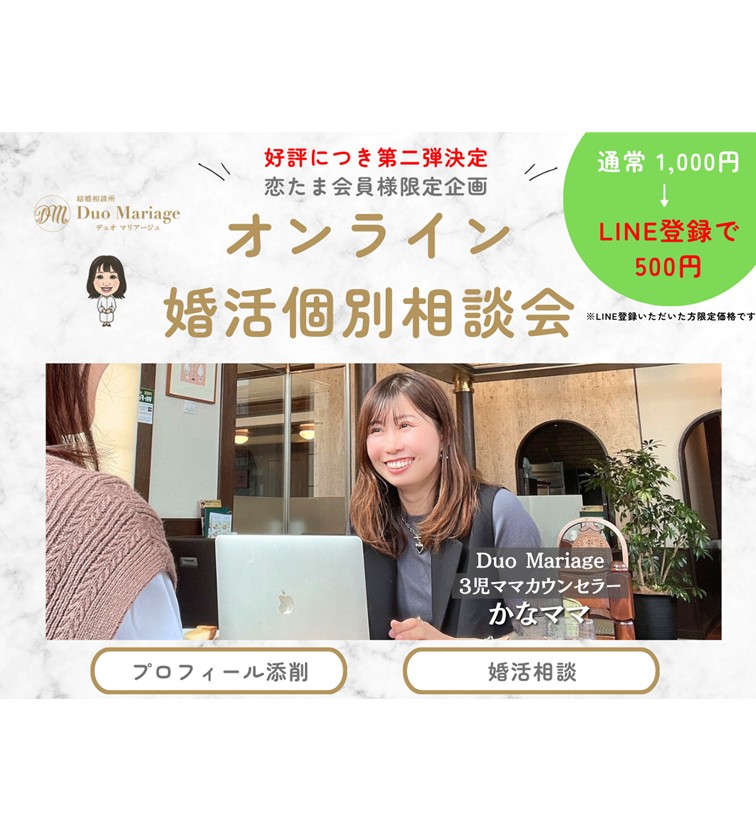 (Duo Mariage)【大好評御礼 第二弾✨】恋たま会員限定 結婚相談所 Duo Mariageオンライン婚活プロフィール個別相談会 2026年1月21日(水)10:00-17:00 / 1月22日(木)10:00-17:00 / 1月23日(金)10:00-17:00 / 1月24日(土)10:00-17:00 Zoom