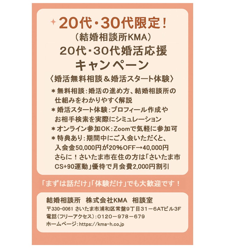 (結婚相談所 株式会社KMA) 20代・30代婚活応援キャンペーン <婚活無料相談&婚活スタート体験> 令和7年12月13日(土)~令和8年1月12日(月)まで ※期間中、希望日時で予約可能(オンライン/来店) オンライン/来店