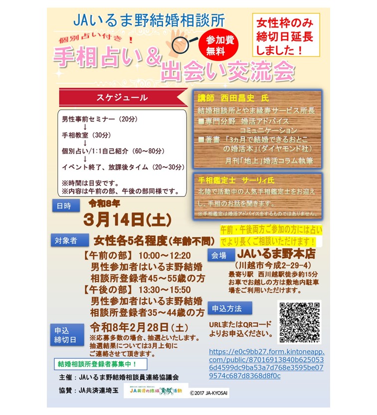 (主催 JAいるま野) 手相占い&出会い交流会
