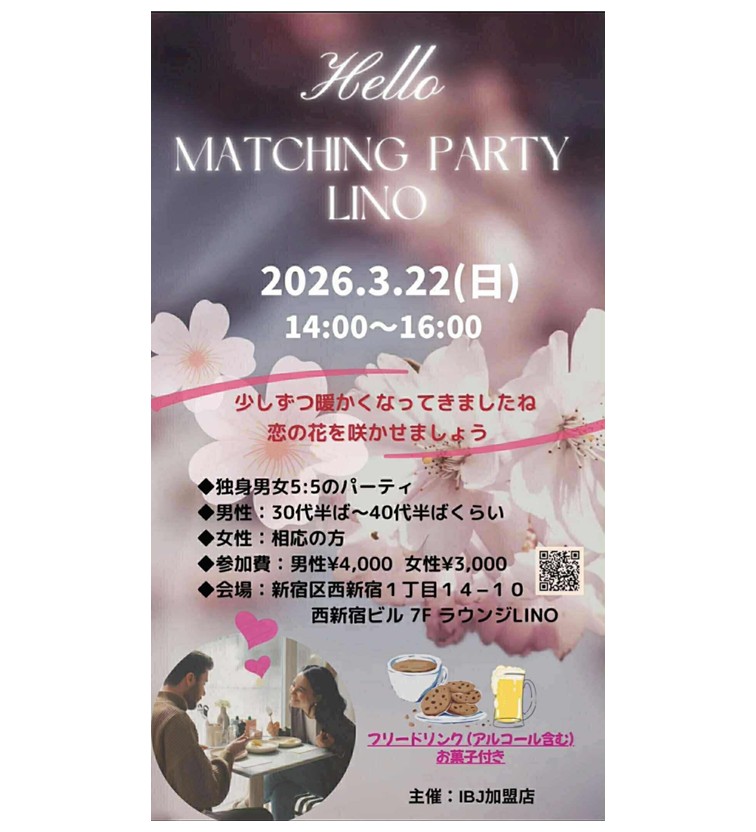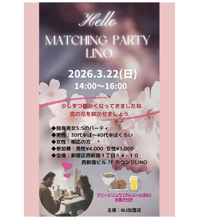 (主催:婚活サポート Junction) マッチングパーティー LINO~少しずつ暖かくなってきましたね、恋の花を咲かせましょう~