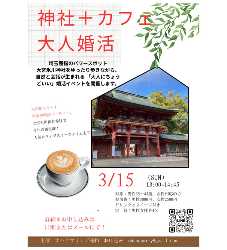 (主催 オハナマリッジ浦和)大宮氷川神社&カフェで楽しむ婚活パーティー