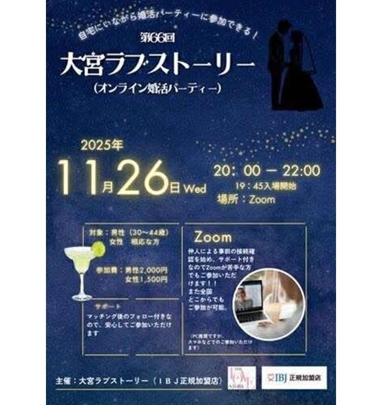 第66回の「♥大宮ラブストーリー」は、男性の年齢条件を30歳~44歳くらいとさせていただきました。女性の年齢条件は設けていないので、奮ってご参加ください。