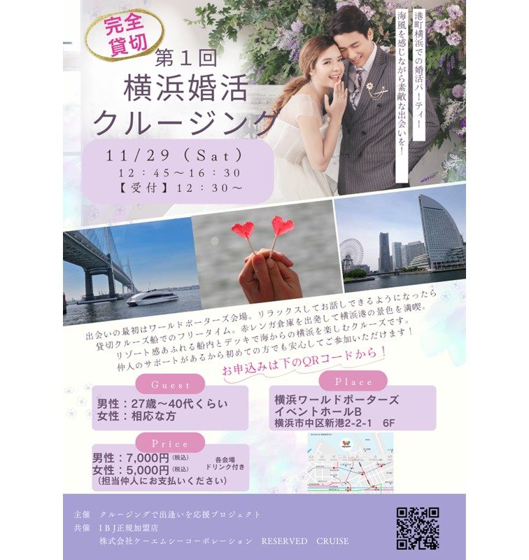 横浜のワールドポーターズの会場で出会って、赤レンガ倉庫辺りを歩お散歩しつつ、横浜港の貸切クルージング船でフリータイムを過ごす婚活イベントのご案内です。