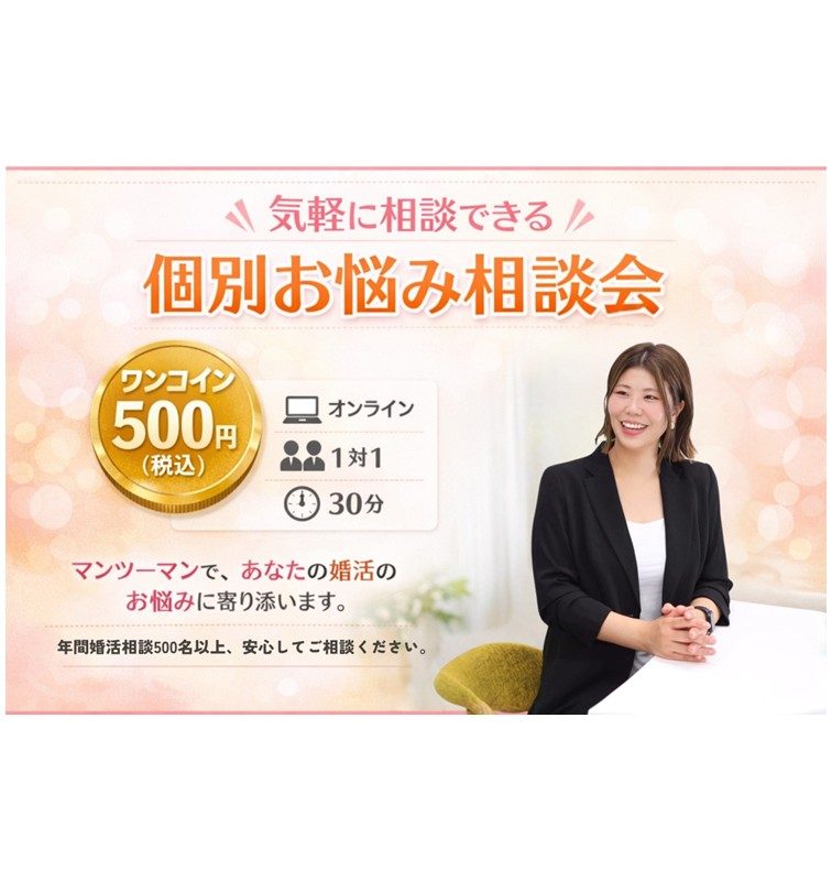 ワンコインで成婚のプロに聞ける|完全個別|オンライン婚活お悩み相談(30分)