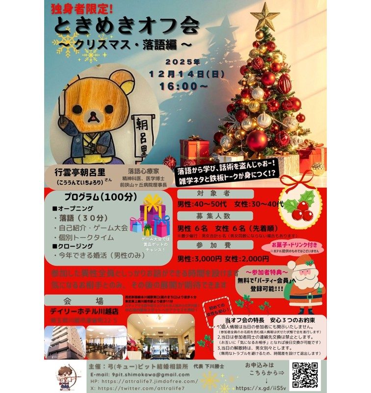 人気の小江戸川越を観光した後に参加できます。落語も聴けて、クリスマスを一緒に過ごせるお相手が見つかるかも? みんなで落語を鑑賞した後に自己紹介、ゲーム大会を経て、参加者の異性全員と個別でお話できる時間を設けます。