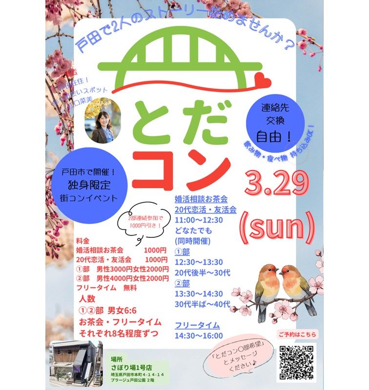 - 11~16時 11~12時半 20代交流会・婚活相談お茶会 12時半~13時半 婚活①部 13時半~14時半 婚活②部 14時半~16時 フリータイム