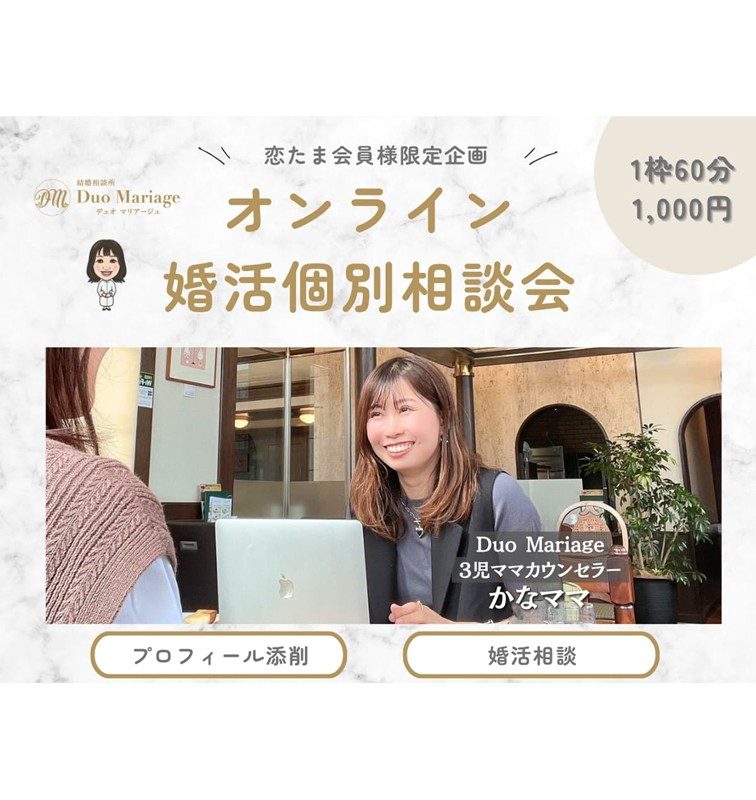 この度、恋たま提携結婚相談所「Duo Mariage(デュオマリアージュ)」による恋たま会員限定のオンライン婚活相談会を開催いたします。