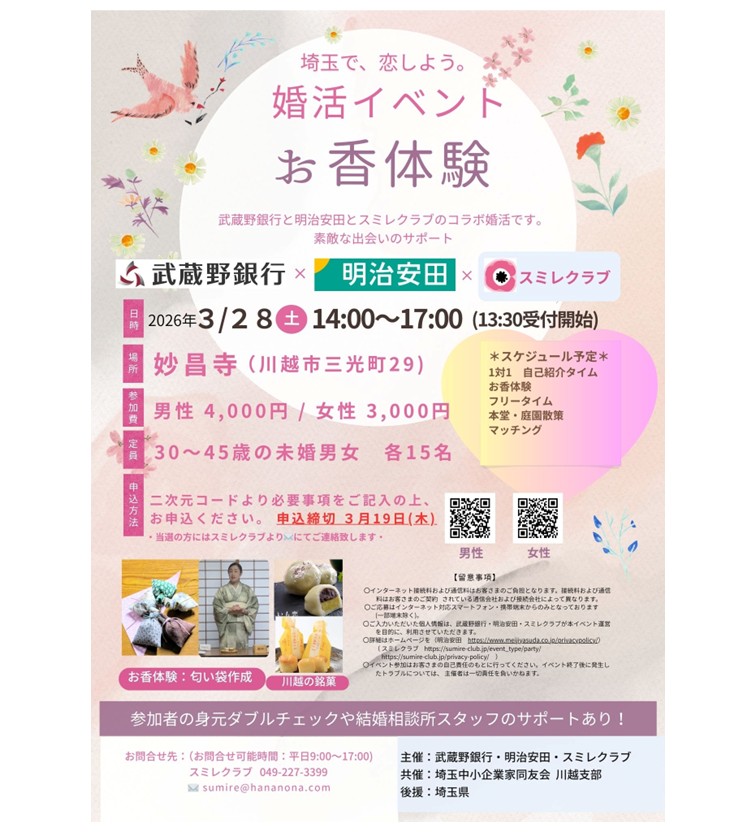 (主催:スミレクラブ) 第9回「婚活の悩み相談会」 【川越】 令和8年2月11日(祝) 令和8年3月14日(土) 【大宮】 令和8年2月 1日 (日) 令和8年2月23日(祝) 令和8年3月20日(祝) スミレクラブ ①川越事務所 (川越駅徒歩5分) ②大宮会議室 (大宮駅徒歩5分) ※個室にてリラックスしてご相談頂けます。