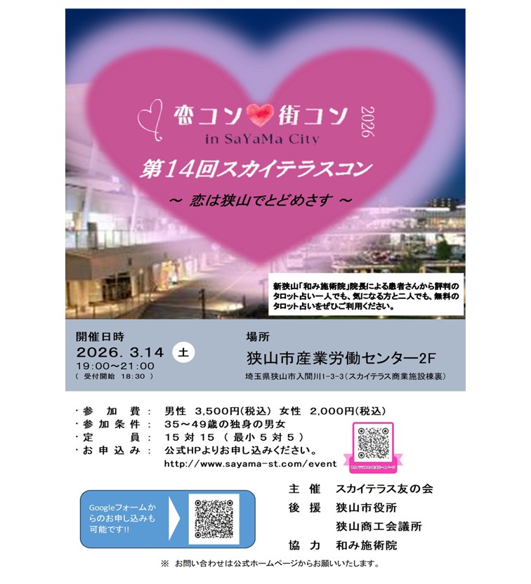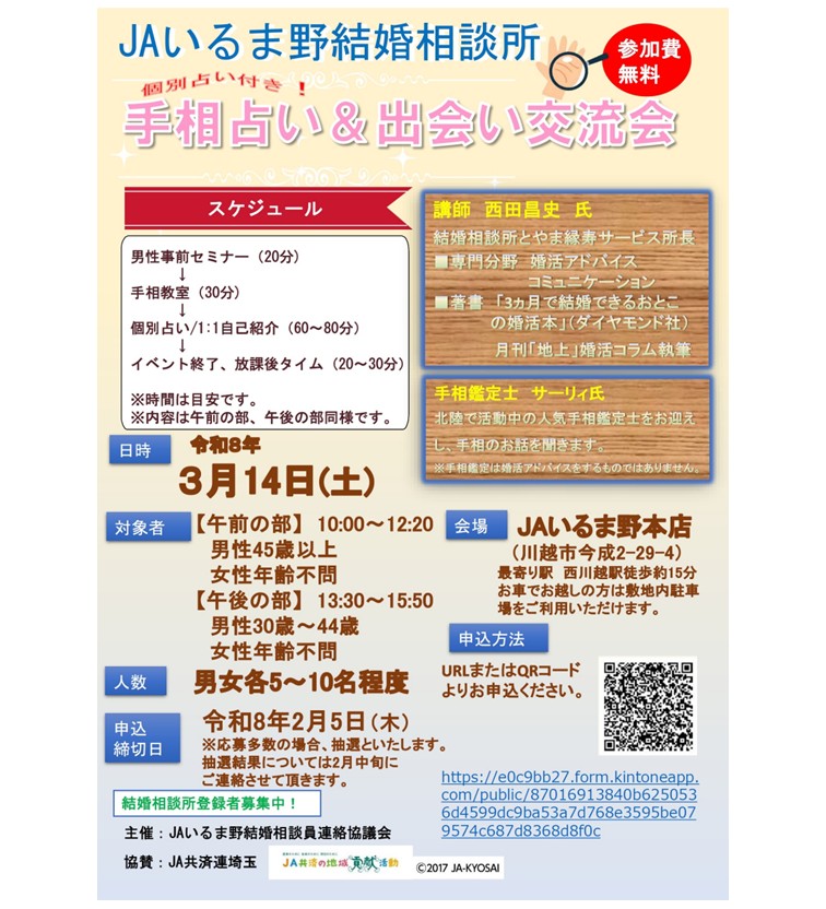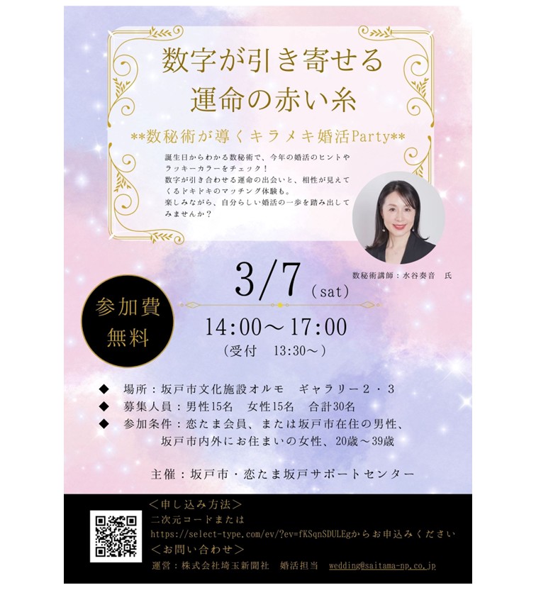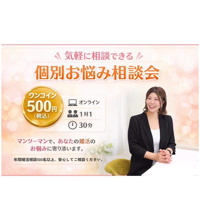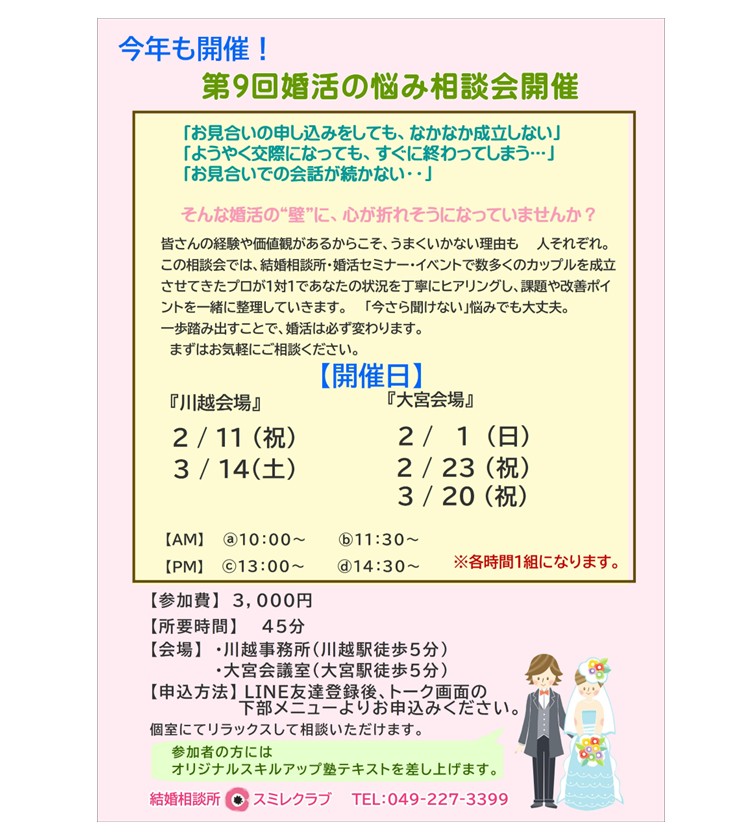 (主催:スミレクラブ) 第9回「婚活の悩み相談会」 【川越】 令和8年2月11日(祝) 令和8年3月14日(土) 【大宮】 令和8年2月 1日 (日) 令和8年2月23日(祝) 令和8年3月20日(祝) スミレクラブ ①川越事務所 (川越駅徒歩5分) ②大宮会議室 (大宮駅徒歩5分) ※個室にてリラックスしてご相談頂けます。